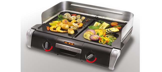 Allerdings sollten Sie bei der Auswahl des passenden Elektro-Grills darauf achten, dass das Gerät genug „Dampf“ unter der Grillplatte macht. Denn nur, wenn das Grillgut heiß genug wird, kann die sogenannte Maillard-Reaktion stattfinden, die für den typischen Grillgeschmack verantwortlich ist. Mit dem Tisch-Grill Family TG8000 mit 2.400 Watt Leistung bietet Tefal einen Grill, der ausreichend Hitze für perfekt gegrilltes Fleisch erzeugt. Der Clou an diesem Gerät: Es verfügt über zwei unabhängig voneinander regelbare Grillplatten. Während auf einer Seite bei hoher Hitze Steaks und Würstchen braten, garen auf der anderen Seite bei geringerer Temperatur Fisch oder Gemüse. Mit einer Grillfläche von 18,5 x 46 cm – das ist etwa so groß wie ein DIN-A3-Blatt – bietet der TG8000 ausreichend Platz für die Grillwünsche der ganzen Familie.