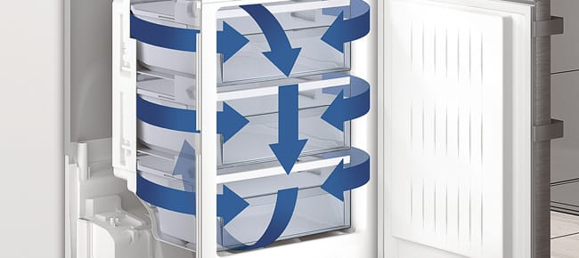 Zudem strömt mit jedem Öffnen warme Luft in das Gerät ein. Das ist vor allem beim Gefrierteil ärgerlich, da sich die Luftfeuchtigkeit auf dem Gefriergut und an den Wänden niederschlägt und vereist. Wenn Sie Ihr Gefrierteil also nicht regelmäßig abtauen wollen, empfiehlt es sich, nach einem Gerät mit NoFrost-System Ausschau zu halten. Hier verhindert eine spezielle Luftführung die Vereisung, sodass Sie sich das manuelle Abtauen ab sofort sparen können.
