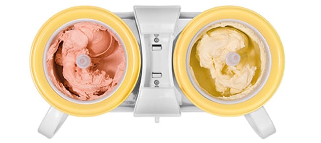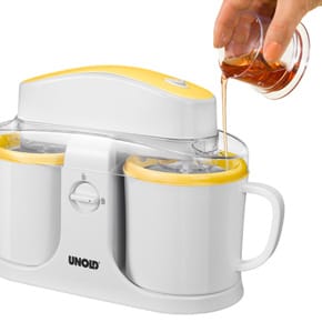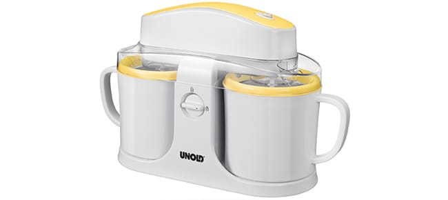 Durch ihren günstigen Preis (ca. 50 bis 100 Euro) sind diese Eismaschinen ideale Einstiegsmodelle für alle Eis-Liebhaber. Da sie nicht aktiv kühlen, sondern nur gleichmäßig rühren müssen, genügt ihnen ein kleiner Elektromotor, der das von oben aufgesetzte Rührwerk antreibt. Um die nötige Kälte zu erzeugen, haben die Geräte einen Kühlbehälter oder Kühlakku, der vor der Eisherstellung bis zu 12 Stunden im 4-Sterne-Gefrierfach vorkühlen muss. Das macht einen bei der Eisherstellung unflexibel, wenn man den Behälter oder Akku nicht ständig im Gefrierfach hat.