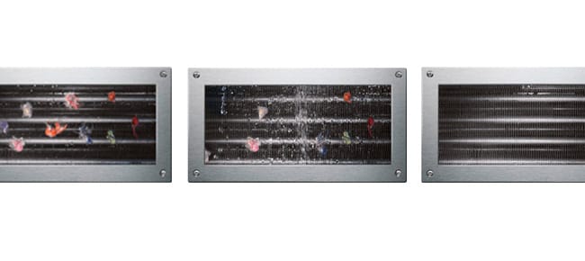 Wenn Flusen und Textilfasern den Wärmetauscher verstopfen, steigt der Energieverbrauch. Geräte mit selbstreinigendem Kondensator spülen die Flusen mehrmals pro Trockenvorgang mit dem gesammelten Kondenswasser aus. Das verspricht auch langfristig beste Energieeffizienz.