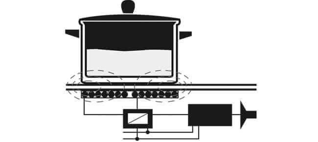Beim Induktionsherd befindet sich unter der glatten, leicht zu reinigenden Glaskeramikplatte eine Kupferspule. Wenn durch diese hochfrequenter Strom geleitet wird, entsteht ein elektromagnetisches Wechselfeld, das im darüber stehenden Topf Wirbelströme erzeugt, die das Metall von Topfboden und Seitenwänden erhitzen. Anders als bei herkömmlichen Ceran- oder Masseherden, die sich erst selbst langsam erhitzen müssen, wird hier die Wärme ganz schnell und genau da erzeugt, wo sie gebraucht wird: im Boden und in den Wänden des Kochgeschirrs. Durch diese kurze Reaktionszeit lässt sich nicht nur der Koch- und Bratvorgang sehr präzise regeln. Es wird auch Zeit und damit bis zu 30 bis 40 % Energie eingespart.