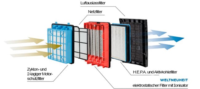Falls Sie Allergiker sind oder mit Allergikern im Haushalt leben, ist die Auswahl des richtigen Filters daher von höchster Bedeutung. Viele Hersteller haben spezielle Geräte für Allergiker im Angebot. So auch der Staubsaugerspezialist Fakir, der in sein Modell „Filter Pro“ gleich acht Filter integriert hat: darunter ein elektrostatischer Filter, der die Luft mithilfe elektrostatischer Energie von kleinsten Partikeln und Allergenen befreit, und ein Aktivkohlefilter, der sogar Gerüche eliminiert. Fakir wirbt damit, dass die Luft nach Saugen reiner sei als zuvor.