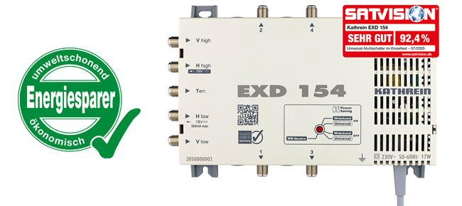 Sobald alle angeschlossenen Fernseher und Receiver ausgeschaltet sind, verbraucht der EXD 154 praktisch keinen Strom mehr. Ist zusätzlich noch der Stromsparmodus Kathrein-Power-Saving aktiviert, wird auch die Stromzufuhr zu den Empfangseinheiten an der SAT-Antenne unterbrochen. Ohnehin agiert der neue Kathrein-Multischalter sehr sparsam: Im Betrieb gibt er sich mit rund 10 Watt zufrieden, und im Standby geht der Verbrauch gegen null.