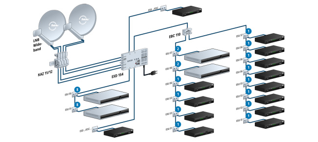 Dass sich mit weniger mehr erreichen lässt, zeigt der EXD 154 auch bei der Signalverteilung. Dank der Wideband-Technologie benötigt der smarte Multischalter nicht mehr 4, sondern nur noch 2 Koaxialkabel zur Verbindung mit SAT-Antenne und LNB. Dafür können gleichzeitig die Signale von 2 Satelliten eingespeist werden, zum Beispiel von Astra 19,2° Ost und von Hotbird 13°. Auch bei den Signal-Ausgängen erreicht der EXD 154 mit wenigen Kabeln mehr Teilnehmer: Bis zu 8 Geräte lassen sich an einem der 4 Signal-Ausgänge über einen SAT>IP-Server wie den EXIP 418 mit LAN und WLAN an das Satellitenfernsehen anschließen, über den neuesten Ein-Kabel-Standard sind es sogar 16 Fernseher oder SAT-Receiver pro Ausgang, und die klassische Verbindung von einem Ausgang mit einem Empfangsgerät ist natürlich auch möglich. Sie gilt aber mittlerweile als „Legacy“, als „Altlast“.